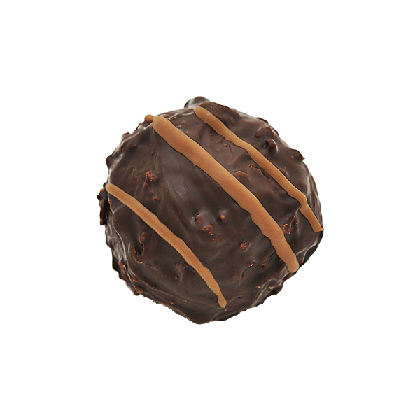 Dunkler Nussnougat, gerollt in Zartbitterkuvertüre mit Haselnussgrieß.